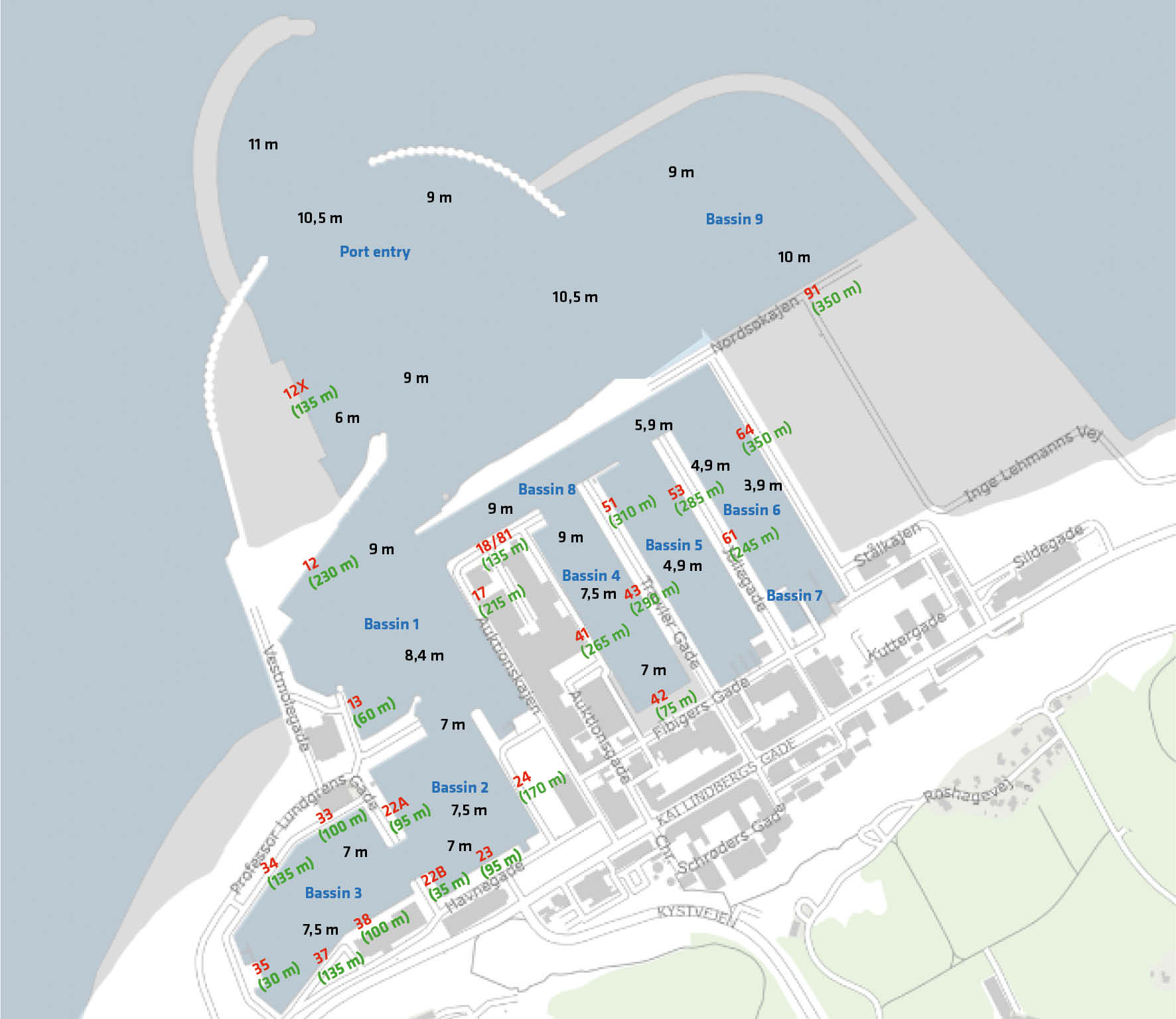 Kaj 91. (24/7 facilitet). Længde 350 meter; dybde 10 meter. Placeret i bassin 9.
